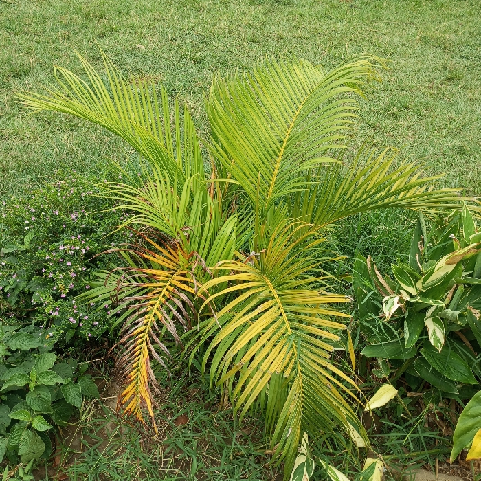 The scene is located in Mahiakalo ward, Kenya. It depicts a young palm tree centrally positioned in a landscaped outdoor environment. The palm consists of multiple green fronds, with newer growth appearing vibrant green. Older, lower fronds exhibit significant chlorosis, appearing yellow, and areas of necrosis with brown, dried tissue, particularly on the left side. Surrounding the base of the palm are patches of sparse green grass and exposed soil. To the left of the palm, a cluster of smaller green plants with minute purple flowers is visible. To the right, larger-leafed plants, some with green and cream variegation, are present. The background consists of a uniformly green, manicured lawn. No individuals, animals, or active interactions are depicted.