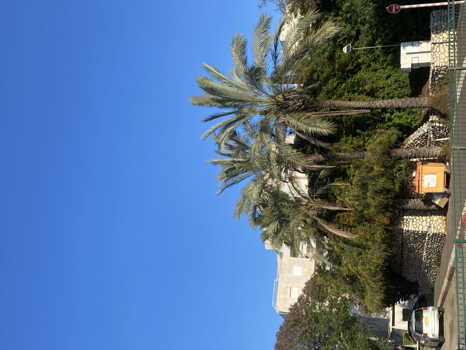 The image depicts an outdoor urban scene in Kiryat Motzkin, Israel, under a clear, bright blue sky devoid of clouds. The upper two-thirds of the frame are occupied by the sky. Below, a residential area is visible, characterized by light-colored multi-story buildings with balconies, partially obscured by dense vegetation. In the mid-ground, three prominent palm trees with green fronds stand centrally, accompanied by various other green and some reddish-brown trees and shrubs that form a lush, overgrown landscape. This vegetation is supported by terraced retaining walls constructed from irregular, light-colored stones. At the street level in the foreground, a paved road with a black and white curb is visible. A light-colored SUV with a yellow Israeli license plate is parked on the left side, facing left. Near the center, against the stone wall, an orange rectangular trash dumpster is present, with cardboard boxes adjacent to it. Further to the right, a white pole supports a solar-powered light fixture embedded within the foliage. On the far right, a red and white circular "No Entry" or "Do Not Enter" traffic sign is mounted on a white pole, with a utility box partially visible behind it. A green metal fence runs horizontally across the bottom of the frame, separating the viewer from the immediate street. No individuals are present in the scene.
