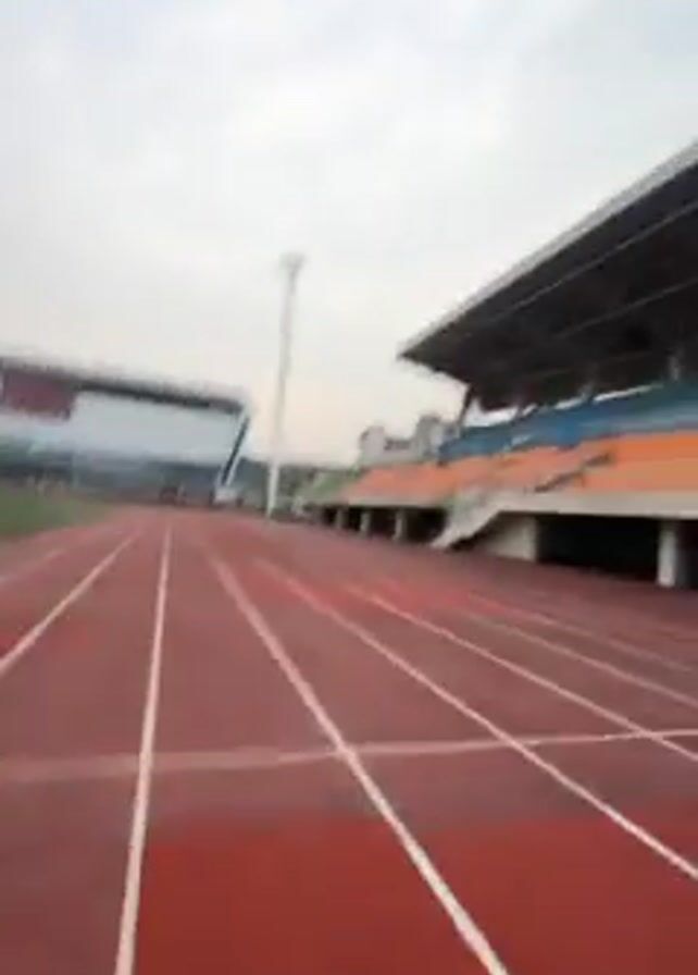 man jogging on a red running track next to a green sports field. The man, dressed in a black t-shirt and gloves, holds the camera up to record himself. He makes a peace sign with his hand at the beginning of the clip. Buildings are visible in the background under a cloudy sky.