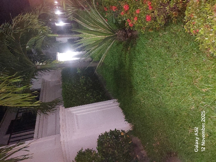 Captured from a low angle at night, the image presents a vibrant green lawn bordered by lush greenery and vibrant red flowering shrubs. Buildings with white walls and illuminated windows line the left side, creating a sense of depth. Palm trees with long, feathery leaves add a tropical touch. The scene is well-lit, showcasing the textures of the grass and foliage. The image bears the inscription "Galaxy A52 12 November 2025" in the lower right corner.