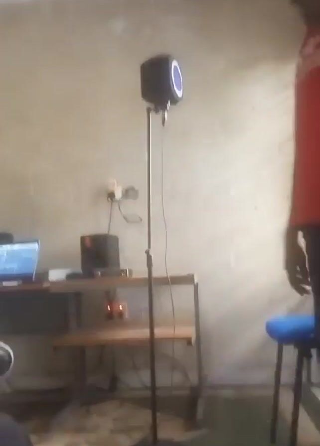 n indoor recording space. A person wearing a red and white shirt and jeans walks past the camera and stands by a stool. Then a shirtless person wearing patterned shorts approaches a table where a laptop and other electronic devices are placed. A microphone on a stand is also visible. The room is sparsely decorated, and the focus is on the music recording setup.