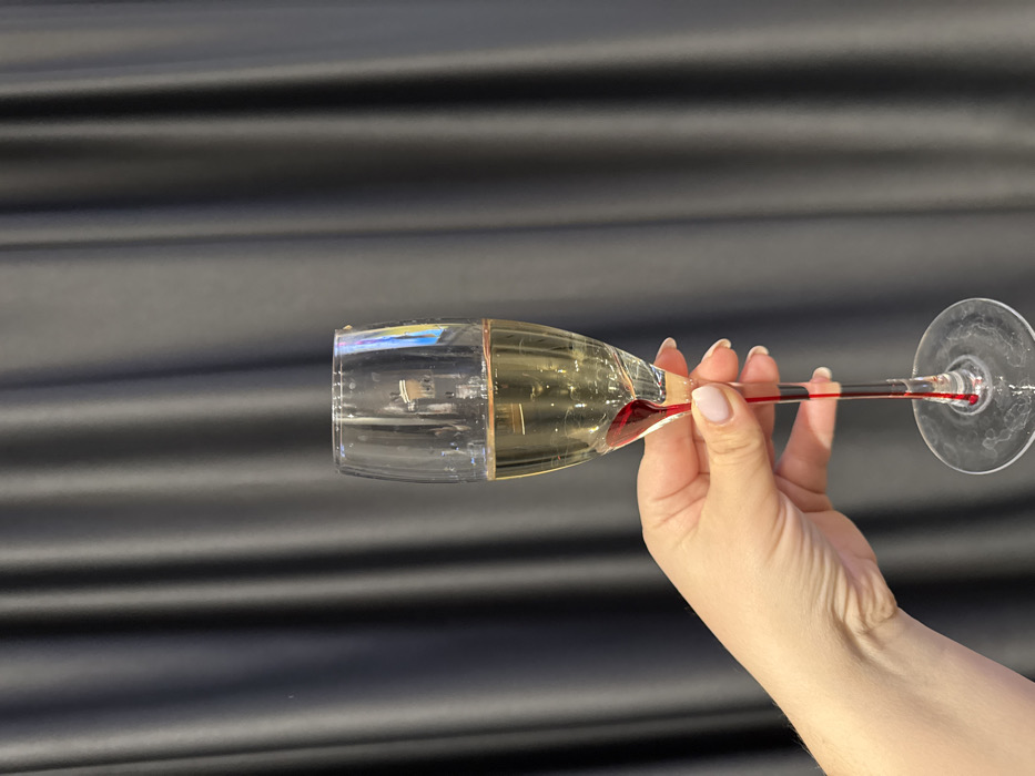 - "The scene, set in Markovo, Bulgaria, shows a close-up of a human hand holding a champagne flute" by FM-8zVRg1, licensed under CC BY 4.0