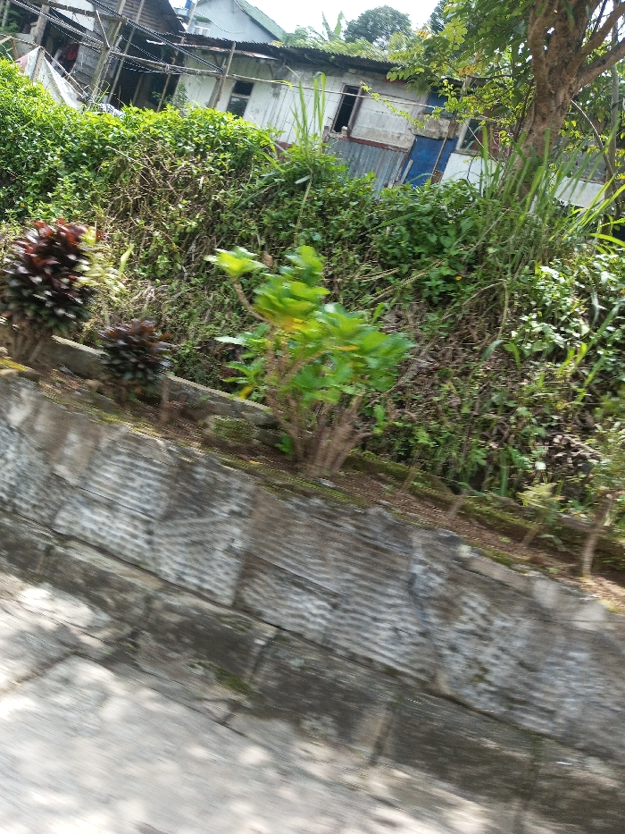 The image depicts an outdoor scene in Vieng Phouka, Laos, under natural daylight conditions. In the foreground, a light-colored, blurry paved surface is visible at the bottom-left, adjacent to a textured concrete retaining wall. This wall, exhibiting horizontal striations and weathering, supports an overgrown earthen slope. On the slope immediately behind the wall, various flora are present, including dark red-leafed shrubs on the left and a prominent, light green-leafed shrub with a cluster of bare stems in the center. The slope is largely covered by dense, untamed green vegetation, comprising tall grasses and leafy plants. In the background, partially obscured by this dense foliage, a dilapidated structure is visible. This building features white-painted or faded walls, with sections constructed from corrugated metal sheeting. Multiple rectangular window openings are discernible, one appearing open and dark, another possibly boarded or covered. The roof consists of corrugated metal sheets, and visible structural elements, likely wood or bamboo, support sections of the building. No individuals, explicit actions, or interactions are present in the scene.