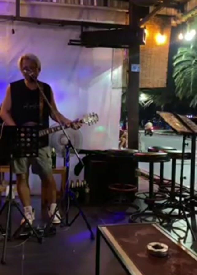 The scene is set at night under the roof of an open-air establishment, likely a bar or restaurant. A man with blonde hair and glasses, dressed in a black tank top and khaki shorts, stands playing an electric guitar and singing into a microphone. He is positioned in front of a music stand holding sheet music, with a fan directed towards him. Behind him, a white curtain hangs. Several black bar stools are arranged around small tables. The background reveals a view of a street with cars and lights. Above him are lights, and a fan. A black box sits behind him, and a cooler or refrigerator can be seen on the left. A glass table with an ashtray is in the right foreground.