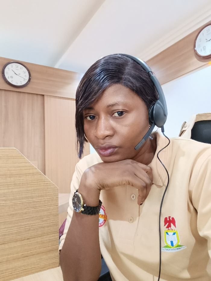 A person with dark skin and dark hair is depicted from the chest up, seated in an indoor office or cubicle environment. The individual wears a light tan polo shirt with a collar. An embroidered emblem on the left chest features the Nigerian coat of arms with the word "IMMIGRATION" visible beneath it, indicating an affiliation with Nigerian Immigration services. A black headset with a microphone boom is worn over the person's right ear. A black wristwatch with a gold-toned circular case and dark face is present on the left wrist. The person's left hand is positioned under the chin. The background consists of light-colored wooden paneling or office furniture, including a wooden partition to the left. Two circular wall clocks with white faces and dark numerals are visible in the upper background, one partially showing approximately 10:20. The scene is consistent with an administrative workstation at an Immigration Quarters facility in Nigeria.