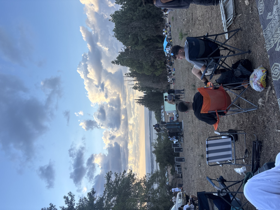 The image captures an outdoor gathering at dusk in the Hof HaCarmel Regional Council, Israel. The scene is situated on a dry, unpaved hillside overlooking a distant body of water, consistent with the Mediterranean Sea, under a sky featuring both clear blue and scattered, illuminated cumulus clouds. Dense coniferous trees border the left and right sides of the terrain and distant hills. In the immediate foreground, the lower portion of a person in white attire is visible on the left, seated on a mat. On the right, a patterned woven mat is partially visible. Two males are seated in folding chairs, facing away from the camera. The left-seated male wears a black t-shirt and occupies an orange chair. The right-seated male wears a light t-shirt and shorts, occupying a dark blue/grey chair, and is turned slightly to his right. A black backpack and a clear plastic bag of snacks are on the ground between them. An empty striped folding chair is also present. In the midground, an event area is established with a large sound system consisting of multiple dark speaker units placed on the ground and a low platform. Several individuals are actively positioned around this equipment. A group of approximately five to seven people are standing atop an elevated structure, possibly a stage or DJ booth, adjacent to the sound system. A light-colored SUV is parked on the left, with a person in white standing nearby. A white trailer is visible further back on the right. Numerous other attendees are scattered across the open, dry ground, standing or grouped. A blue tarp or canopy is visible amongst a cluster of people on the mid-right. In the background, a parking area densely filled with vehicles is visible down the slope from the event. Beyond this, the body of water extends to the horizon, where it meets a distant landmass under the dimming light.