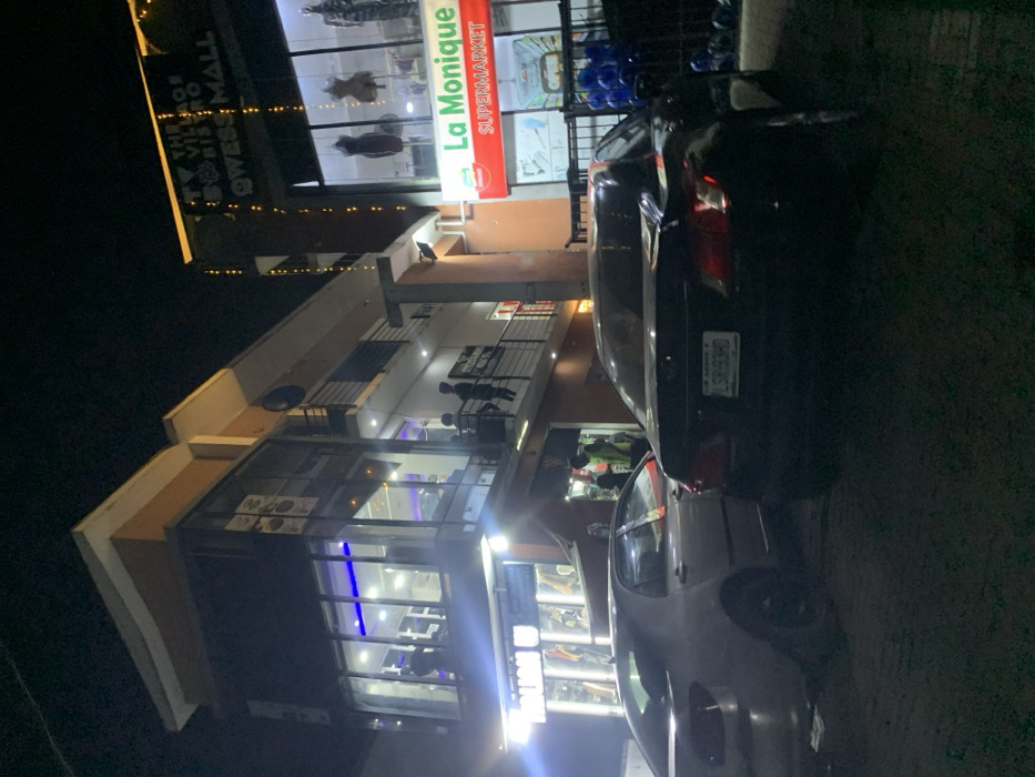 A three-story building showcases "La Monique Supermarket" on its upper level