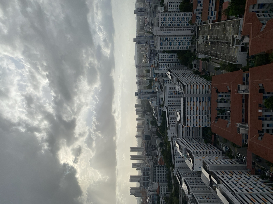 An elevated, panoramic view captures a dense urban cityscape in Singapore under a heavily overcast sky