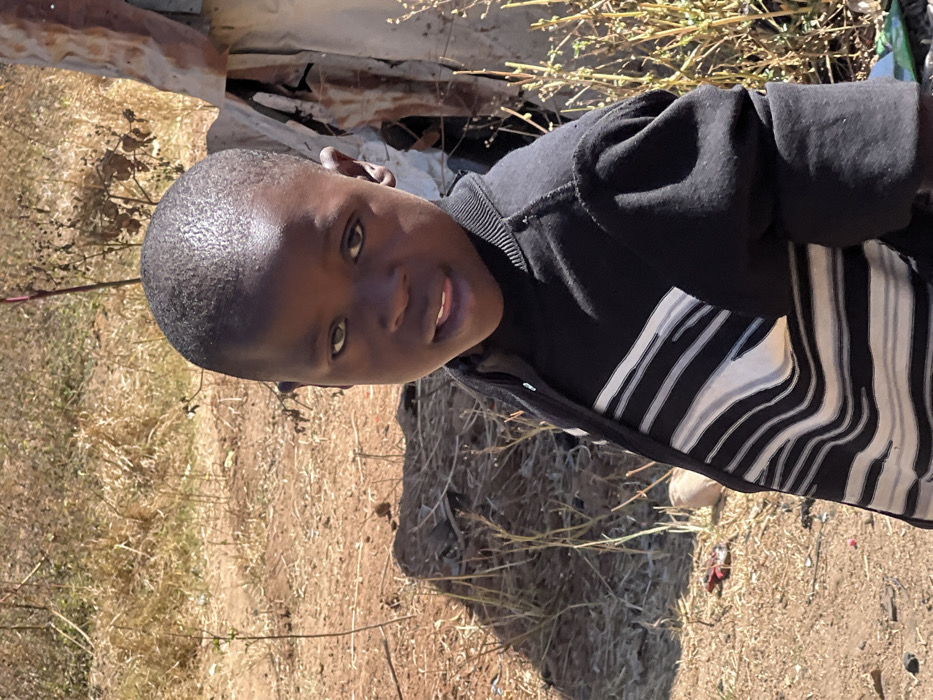 The scene, identified as occurring in Du, Nigeria, depicts a young child outdoors. The child, of African descent, has short dark hair and dark brown eyes, looking directly at the camera with a slightly open mouth. They are wearing a black collared long-sleeve shirt over a black and white horizontal striped t-shirt; the sleeves of the outer shirt are rolled up past the elbows. The environment is characterized by dry, reddish-brown soil and sparse, desiccated light-brown vegetation. To the child's left, a low, dark mound of debris or organic material is visible. To the child's right, a partial structure made of weathered, possibly rusty, corrugated metal sheets is present, suggesting a makeshift dwelling or enclosure. The scene is brightly lit by natural sunlight.