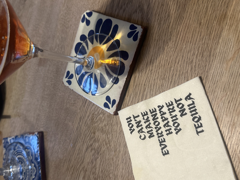 The image displays an indoor setting within the city of Luxembourg, Luxembourg, specifically an indeterminate venue. A stemmed glass containing an amber liquid stands on a square ceramic coaster in the foreground. The coaster is white with blue floral motifs and a brown edge; light reflects an orange glow beneath the glass's base. To the left, an off-white napkin is laid flat, displaying the black text: "YOU CAN'T MAKE EVERYONE HAPPY YOU’RE NOT TEQUILA". Partially visible in the upper left background is a second blue and white ceramic coaster featuring a different circular pattern. All items rest on a light brown wooden table with visible grain. No individuals are present in the scene.