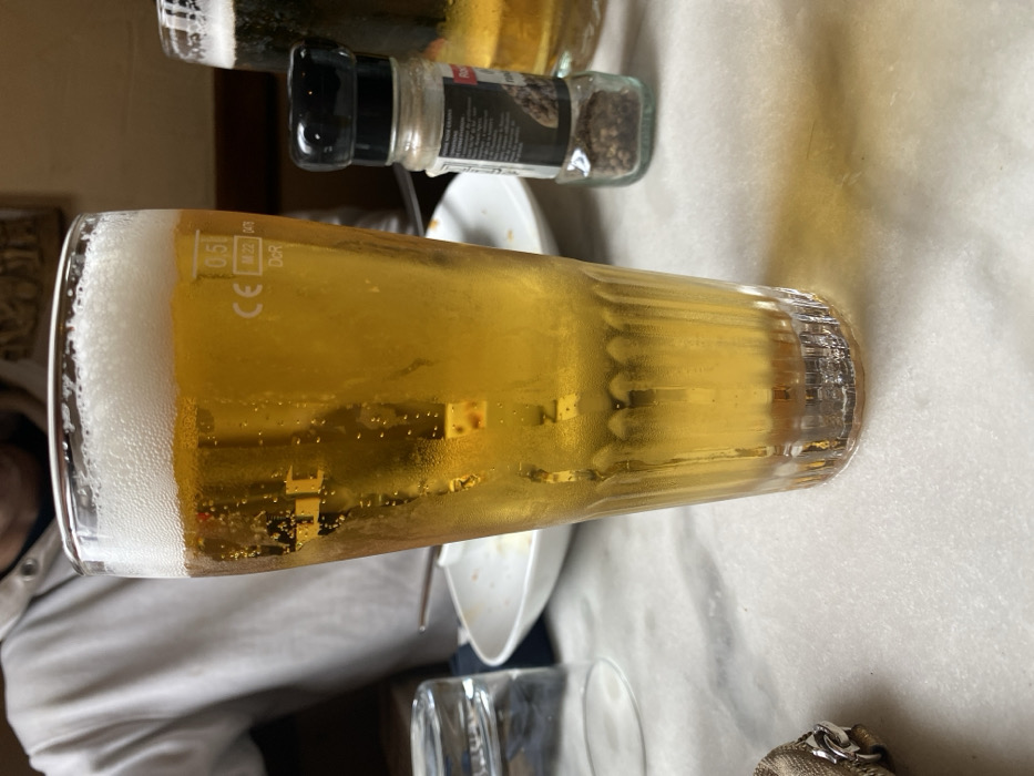 A forensic examination of the image reveals an indoor scene in an establishment within Verlinghem, France, consistent with a restaurant or bar setting. Centered prominently on a light-colored, possibly marble, tabletop is a tall, ribbed glass filled with pale yellow, effervescent beer, topped with a white foamy head and exhibiting external condensation. The glass is marked with "0.5 L", "CE", "M 22", "0475", and "DoR". To the left of this glass, a portion of an inverted clear drinking glass and a beige zippered item are visible on the table. Directly behind the main beer glass, an empty white plate is positioned. To the right of the main glass, a clear glass pepper grinder with a black cap, containing dark pepper granules, stands. Further to the right, another glass containing a darker beverage is partially visible. In the blurred background, to the left, a person wearing a light-colored hooded sweatshirt is partially visible, with only their upper torso and a portion of their lower face discernable. The broader background shows warm, muted tones, possibly indicating wood paneling or painted walls, with a framed object faintly visible. No explicit actions or interactions are captured beyond the static arrangement of objects on the table.