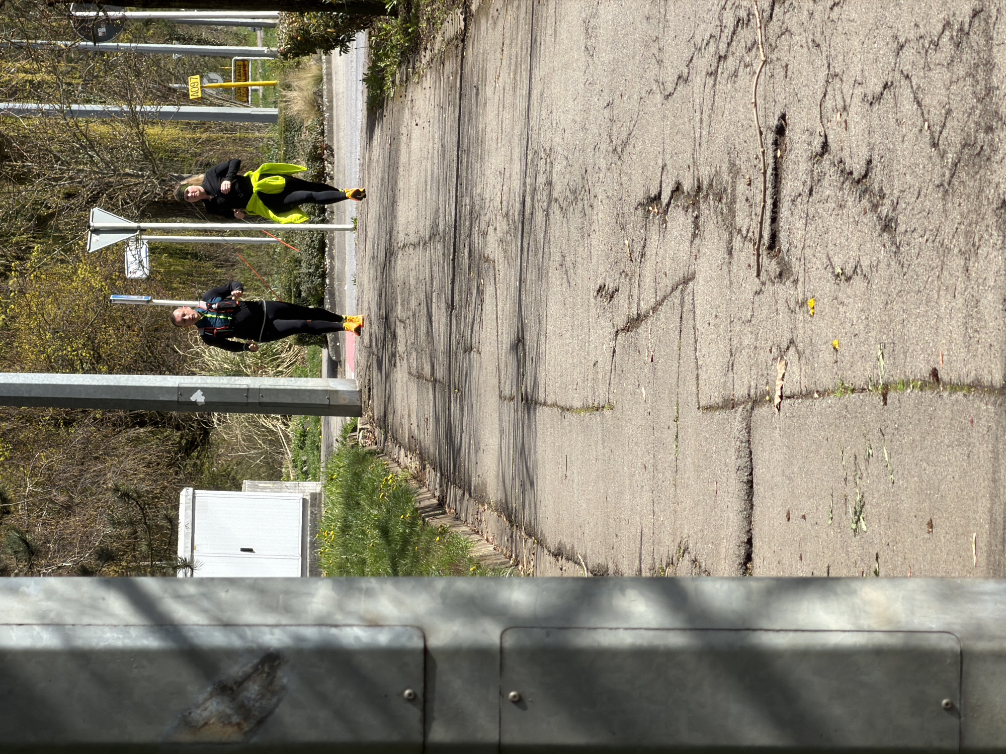 Two people are jogging on a cracked asphalt path. One person is wearing black athletic clothing and bright orange shoes. The other person is also wearing black athletic clothing with a bright yellow jacket tied around their waist. The path is bordered by grass and trees. Signposts are visible near the joggers. The location is likely Esch-sur-Alzette, Luxembourg. A metal fence or barrier appears in the foreground.