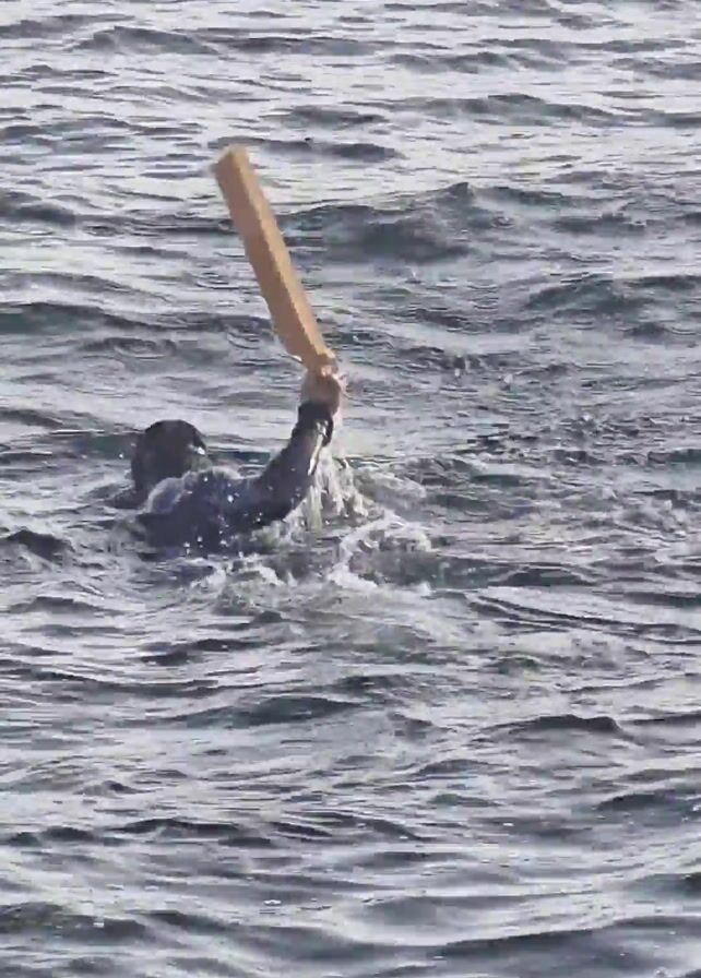 . A person wearing a dark gray wetsuit, swim cap, and goggles swims in choppy, gray waters. The person holds a rectangular piece of wood in their left hand, alternating between swimming with it and holding it overhead.