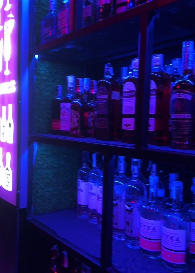 - "bar with shelves of alcohol bottles illuminated with blue and purple lights" by FM-4dHfr1, licensed under CC BY 4.0