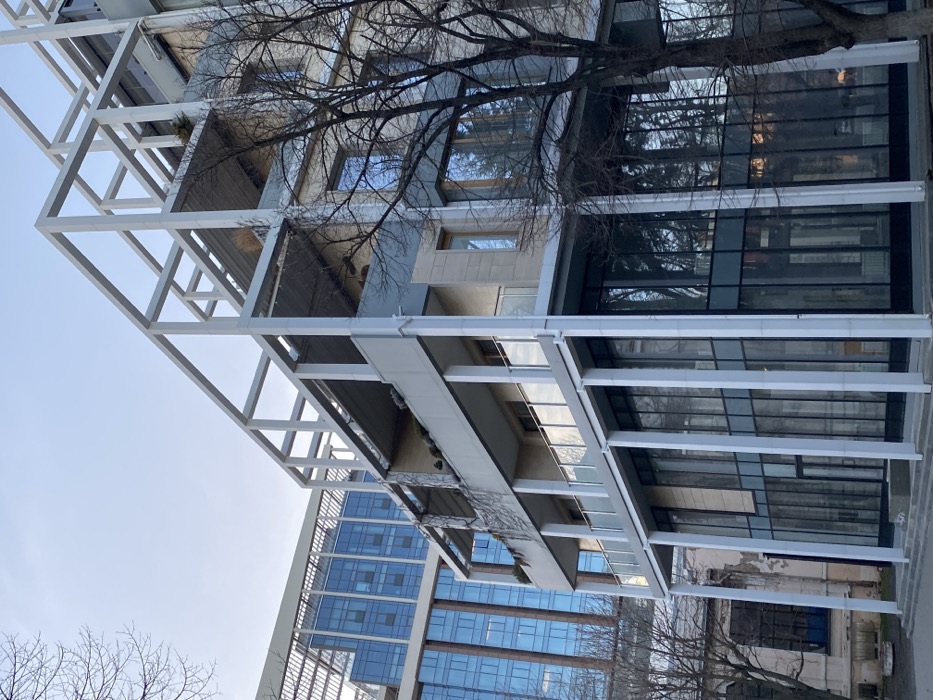 The image captures an urban street scene in Rostov-on-Don, Russia, centered on a modern multi-story building. This structure features a distinctive white external skeletal framework of horizontal and vertical beams extending from its upper levels and forming prominent columns at the ground floor. The building's facade consists of light-colored stone or paneling interspersed with sections of darker grey material and numerous windows, some with wood-toned frames. Multiple balconies with clear glass railings are present on the upper floors, some containing small, bare plants in planters. The entire ground floor level is composed of expansive glass panels, serving as storefronts or large windows. In the background, to the left of the main building, stands a taller, contemporary high-rise building characterized by a blue glass curtain wall facade and a tiered roof structure. To the far left, partially obscured behind the main building's lower levels, an older, possibly derelict building with exposed, decaying plaster and brickwork is visible. Bare deciduous trees with intricate dark branches frame the modern building on both sides, their reflections visible in the glass surfaces. The sky is a clear, pale blue, indicating daylight conditions. The ground immediately in front of the main building appears to be a paved or concrete surface with a few steps leading to an entrance. No individuals or specific activities are observable in the scene.