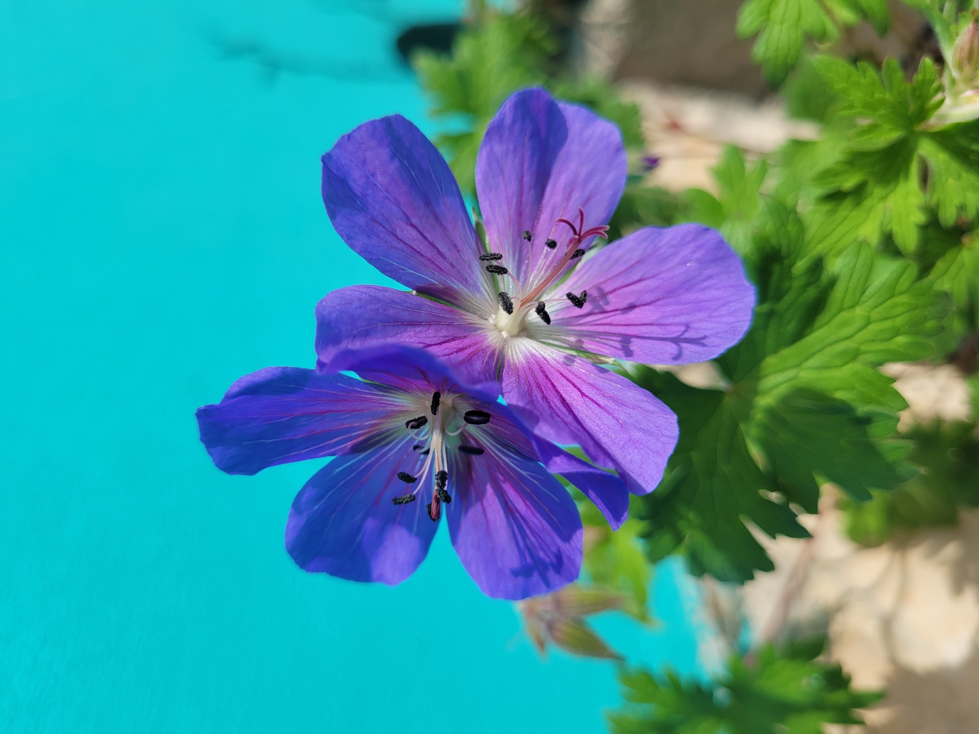 Two purple geranium flowers are in full bloom. The flower petals have fine, dark veins. The flowers' dark stamens and reddish styles are clearly visible. The flowers are positioned against a vibrant turquoise surface, while green leaves and a blurred beige surface are visible on the right side of the image. The image was taken in the city of Cherven Bryag, Bulgaria.
