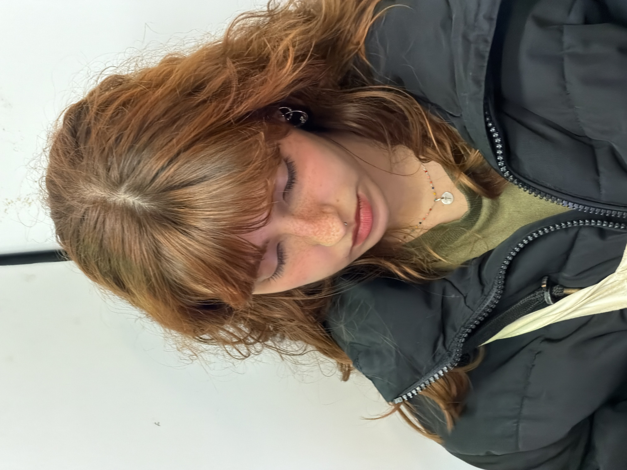 A young, fair-skinned person with auburn hair and freckles lies with eyes closed. They wear a green sweater beneath a black puffer jacket. The person has a piercing on their left nostril and an earring on their left ear. A colorful necklace with a circular pendant is visible. The background is plain white. It is not possible to confirm if the location is in the city of Madrid, Spain.