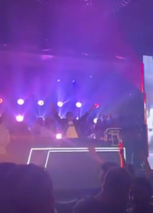 music performance in a club-like atmosphere. In the background, on an elevated stage, there are people, possibly performers, operating DJ equipment behind a light-up countertop. The stage is illuminated with a mix of violet, blue, and white stage lights. Lasers flash intermittently above the crowd. In the foreground, a crowd of people is visible, silhouetted by the stage lighting. Some individuals are raising their hands, apparently enjoying the performance. To the right, there's a large screen, but the content displayed is blurry, mostly white. The ceiling has circular patterns and visible pipes. The overall environment is dark, with the lighting concentrated on the performers and the stage.