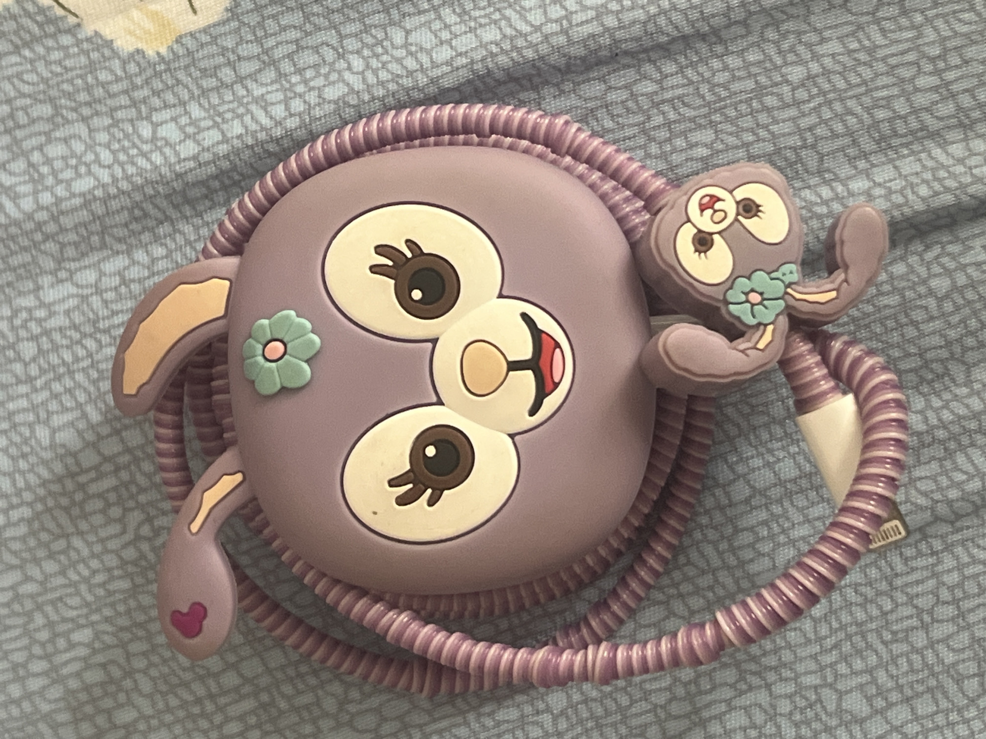 The scene is set in the city of Dar es-Salaam, Tanzania. A large, round, purple object, shaped like the head of the cartoon rabbit StellaLou, is centrally positioned on a light blue patterned fabric surface. This object features prominent beige and white eyes with dark brown pupils and eyelashes, a small beige snout with a black smile and red tongue. Two elongated purple ears extend from its upper sides, with a small pink heart detail visible within the right ear. A light green flower with a pink center is affixed to the right side of the main head. A coiled purple cable, striped with lighter purple or pink segments, is wrapped around this central purple object. Attached to this cable, positioned near the upper left of the main object, is a smaller, flat purple charm also depicting StellaLou's head, which has a light blue-green flower with a pink center on its top. A white male connector, consistent with a Lightning or USB-A interface, is partially visible at the end of the coiled cable, situated towards the upper left. The background fabric displays a subtle, repeating light gray geometric pattern, with a section of a yellow and white floral design discernible in the lower right corner.