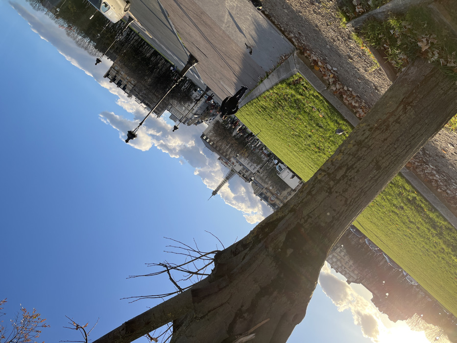 The image depicts an outdoor urban scene in Paris, France, likely adjacent to the Champ de Mars, under clear blue skies with significant cumulus cloud formations. The perspective is tilted counter-clockwise. In the immediate foreground, a substantial tree trunk with bare branches occupies the lower left quadrant, extending diagonally upwards and right. The ground around its base features dry leaves and sparse grass. A broad expanse of bright green lawn stretches across the middle of the frame, bordered by a concrete curb separating it from a paved pedestrian walkway to the right. On this paved walkway, a dark, ornate street lamp stands prominently. Further along the walkway, a solitary individual in dark clothing walks away from the viewer, moving from right to left. Two pigeons are visible on the ground near the walkway. In the mid-to-background, the upper section of the Eiffel Tower rises distinctly against the sky, positioned to the left of a horizontal cloud band. Below and surrounding the tower are several multi-story buildings, consistent with Haussmannian architecture, indicating urban density. A white commercial van is partially visible on a street to the far right. Indistinct figures and other vehicles are present in the distant background. Low-angle sunlight illuminates the scene from the left, casting shadows and highlighting cloud contours.