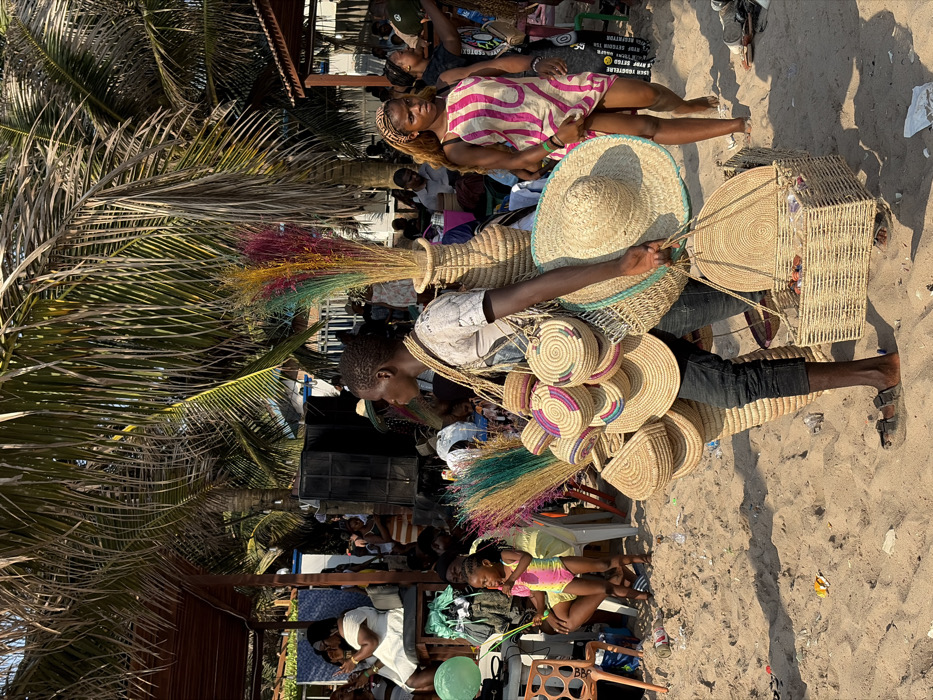 The image depicts a crowded outdoor scene on a sandy beach in Mopo Onijebu, Nigeria. The central figure is a dark-skinned male vendor, appearing to be in his late teens or early twenties, walking right-to-left across the frame. He wears a light-colored, patterned t-shirt, dark jeans, and black sandals on his left foot, with his right foot bare. He is heavily laden with various woven straw products, including numerous hats of different sizes and designs, some with colorful accents, strapped to his back and shoulder. He also carries a tall woven vase containing colorful, dyed decorative grasses or brooms, and holds a rectangular woven basket filled with smaller items in his right hand. To the vendor's left, a light-skinned woman with long, light brown hair styled with a patterned headband walks towards the right. She wears a sleeveless, light-colored dress with a wavy pink pattern and appears to be barefoot. Her left arm is slightly bent, and her right arm is partially obscured. Behind her, other individuals are visible in the background, some observing the scene. To the vendor's right, under the shade of a wooden structure with a corrugated roof, several people are seated on various chairs and benches. A young dark-skinned child in a multi-colored (pink, yellow, green) swimsuit sits on a white plastic chair, holding a green object. An adult woman in a white dress is seated further back, holding a mobile phone. A large speaker system is visible beneath another thatched structure. The ground is covered in light brown sand, with some scattered debris, including plastic bottles and wrappers. Overhead, numerous large palm fronds from several palm trees provide natural shade, with a bright sky visible between the fronds. In the distant background, several buildings and more people are present, indicating a bustling environment.