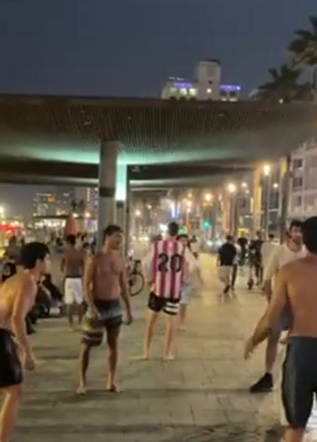 In an outdoor nighttime setting, a group of young men are engaged in a game, apparently of volleyball, although they are using their feet rather than their hands. The players are shirtless or wearing tank tops and appear to be on a wide paved walkway with lampposts and other pedestrians in the background. There is a covered structure with overhead lighting and pillars nearby. The group is diverse. In the distance is a cityscape with buildings and lights. The overall atmosphere seems relaxed and casual.