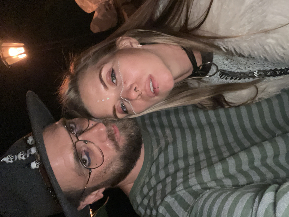 A tilted close-up shows a couple posing for a selfie. The woman, with long blonde hair and facial jewelry, wears a white, furry top and a black choker. The man sports round glasses, a beard, and a wizard hat adorned with small skulls. They are illuminated by dim lighting in what appears to be an outdoor or nighttime setting.