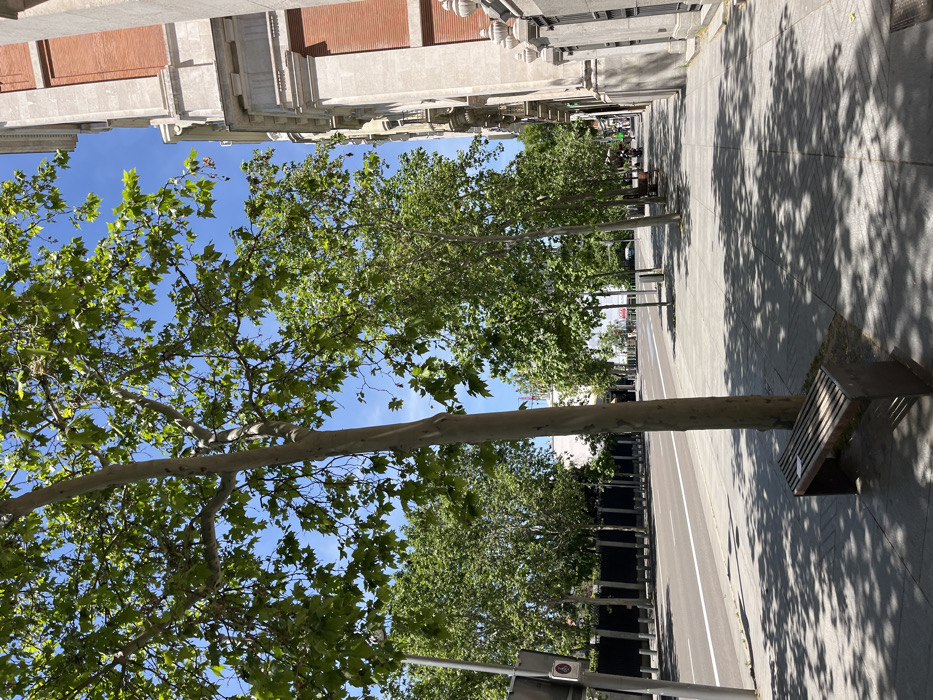 The image depicts a wide street in Madrid, Spain (latitude: 40.434, longitude: -3.687). The street is lined with trees on both sides, and the sidewalk is made of light-colored stone. A single bench sits in the shade of a large tree on the left side of the image, facing the street. In the distance, there are buildings with windows and a red roof. The street is empty of traffic, and there are only a few people walking in the distance. The day is sunny and bright. The sky is a bright blue with no clouds. The trees are all green and leafy, and the sidewalks are clean and well-maintained. The scene is quiet and peaceful.