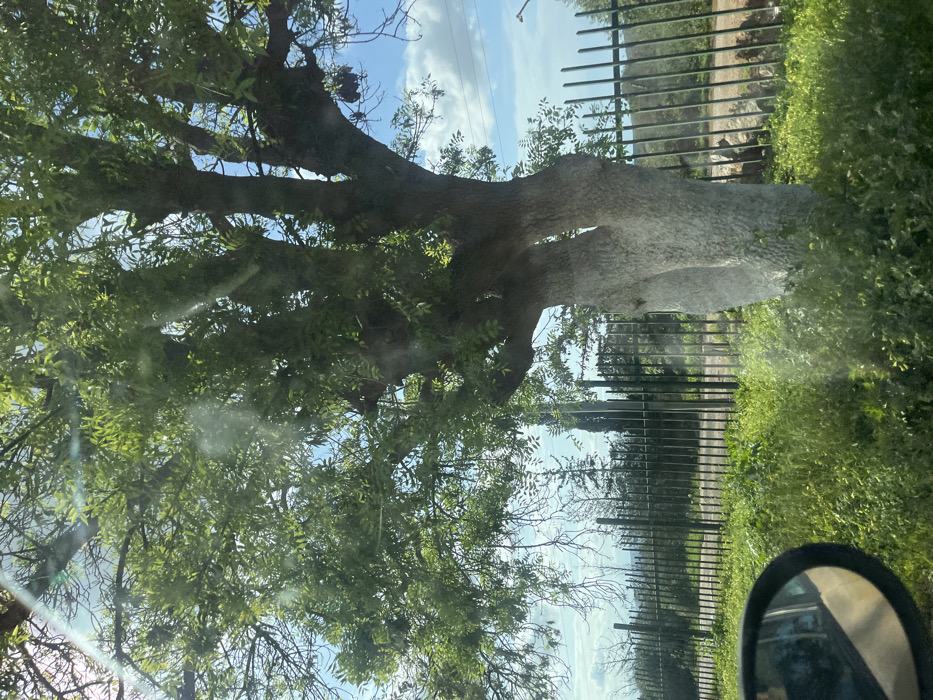 The image depicts an outdoor scene in VAS Fellaoucene, Algeria, viewed from the interior of a vehicle. A large, multi-trunked tree with dense green foliage dominates the central and upper portions of the frame. The lower segment of the tree's main trunk is painted white. Behind the tree, a dark metal fence composed of vertical bars runs horizontally across the mid-ground. Green ground vegetation, including grass and weeds, covers the immediate foreground and extends to the base of the fence. Beyond the fence, an unpaved dirt path or area is visible, followed by distant sparse trees and vegetation. The sky is clear blue with scattered white cumulus clouds. A black-framed side-view mirror from the observing vehicle is present in the lower-left corner, reflecting an indistinct part of the vehicle's interior or side. The scene is brightly illuminated by natural sunlight, evidenced by distinct lens flare indicating direct light on the camera lens, likely through a windshield. No human figures or discernible actions are present.
