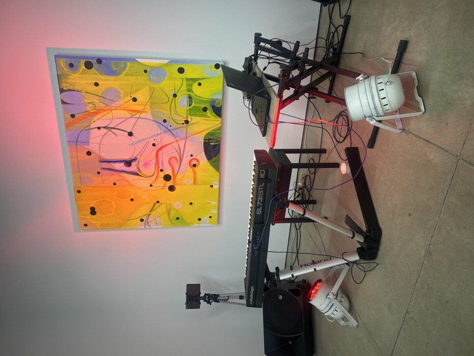 A colorful abstract painting hangs on a white wall, illuminated by a red light source. In front, a Roland keyboard sits on a stand, positioned near a speaker and another light. Cables and stands clutter the floor. A laptop is perched on a separate stand. The scene seems to capture a music or performance setup in a studio or exhibition space.
