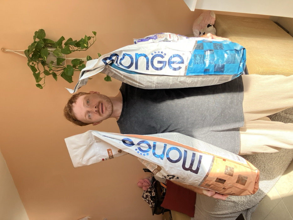 The scene is an indoor residential space in Tel Aviv, Israel. A fair-skinned male, with short reddish-brown hair and light stubble, stands centrally, looking directly at the camera with a neutral expression and slightly open mouth. He is wearing a dark gray t-shirt and light beige corduroy pants. He holds a large, white "monge" brand pet food bag in each hand, extended outwards. The bag in his left hand features an orange-brown bottom section with square patterns, and the "monge" logo is printed vertically in blue. The bag in his right hand displays a blue patterned bottom section, also with the "monge" logo printed vertically in blue. The background consists of light peach-colored walls. To the upper right, a green potted plant with cascading vines hangs from a wall hook. A light brown upholstered bench is visible at the lower right, and a sofa or bed with a red throw pillow and a dark, patterned item is present at the lower left. Natural light illuminates the area from the left, casting shadows to the right.