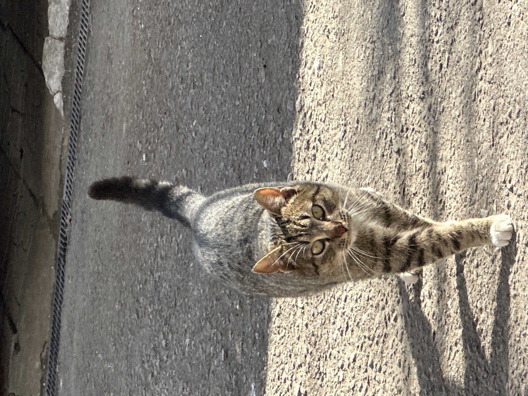 A tabby cat stretches on a concrete surface, likely a sidewalk or street, in the city of посёлок опытного хозяйства «Ермолино», Russia. The cat is facing upwards in the frame, with its head tilted slightly to the left. Its body is mostly in shadow, while its right front paw is in direct sunlight. The cat's tail extends to the left. The concrete surface appears rough and worn. The edge of a building is visible to the left.
