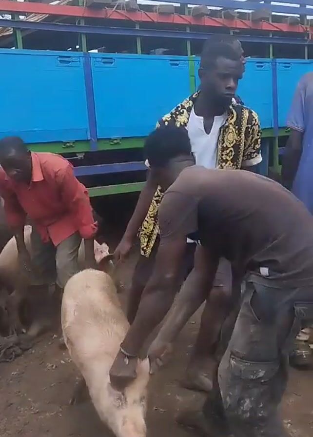 A group of men load live pigs onto a flatbed truck in a muddy area