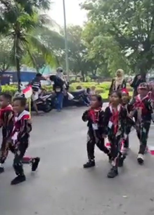 group of young children marching in a parade on a paved road lined with trees and parked motorbikes. The children, mostly girls, are dressed in camouflage-patterned outfits with red scarves and hats, and each child carries a small Indonesian flag. Adults and other people watch the parade from the sidelines. The weather appears to be fair.