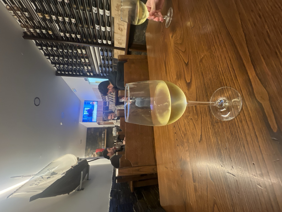 A wine glass filled with white wine sits on a wooden table. Another glass is partially visible in the upper right. In the background, people are seated at the table. A wall with wine bottles lines one side of the room, and a boat sculpture adorns the opposite wall. A television screen is visible in the middle distance.