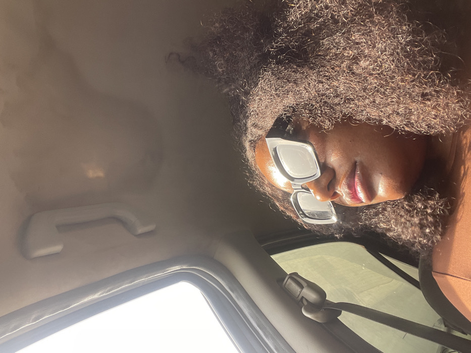 A person with dark skin and voluminous dark curly hair is depicted in a medium shot, seated inside a vehicle