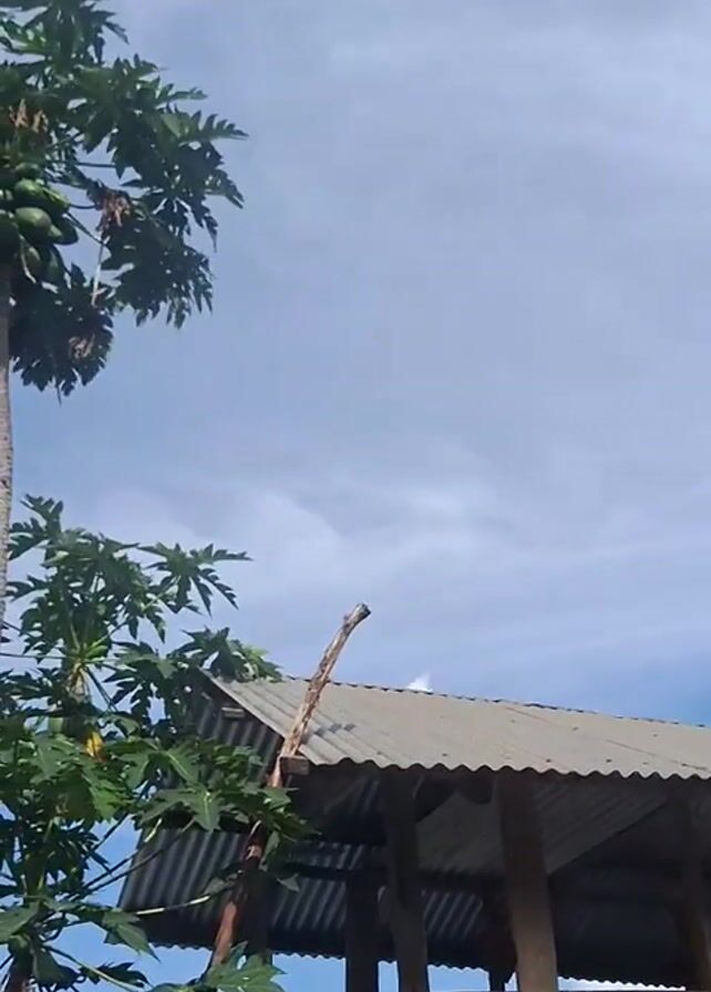 A crow is sitting on a broken tree branch on the corner of a roof. The camera zooms out to show a tall papaya tree with a few ripe papayas growing. The sky is blue with puffy white clouds.