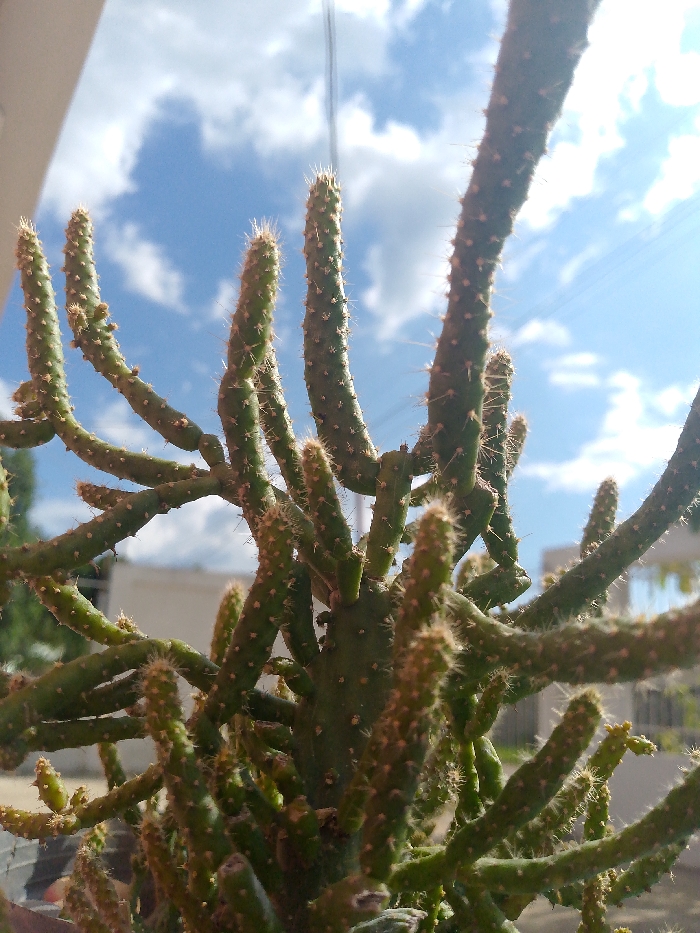 A cactus with many green, elongated segments covered in short spines dominates the frame. These segments branch out in various directions, obscuring parts of the background. In the background, a blue sky dotted with fluffy white clouds is visible, along with blurry shapes of buildings. The overall scene is bathed in sunlight, highlighting the textures of the cactus and creating a vibrant contrast between the plant and the sky.