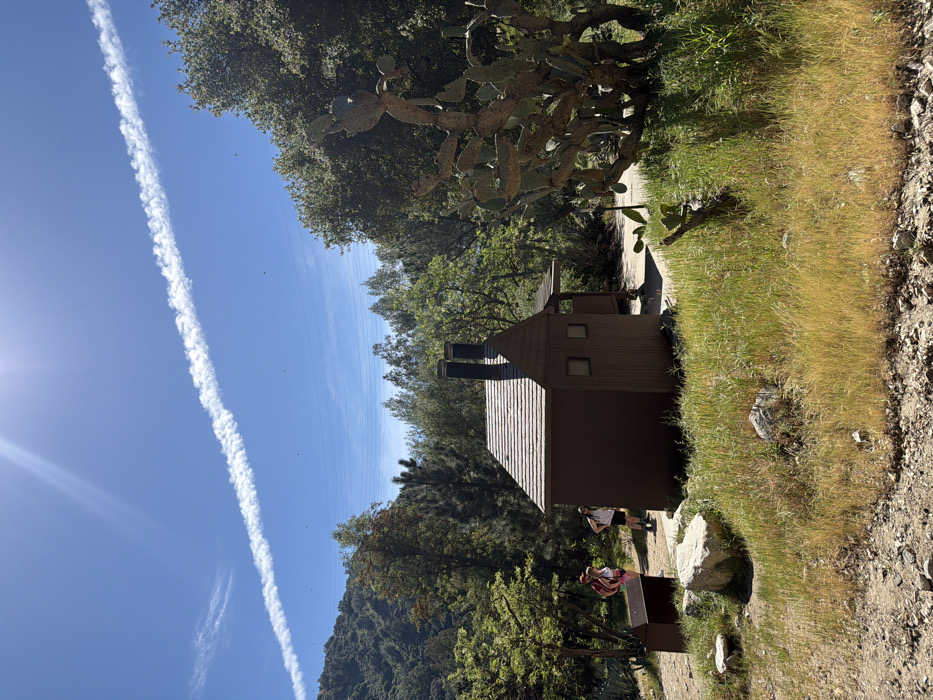 The image captures an outdoor scene at Millard Canyon in Pasadena, United States of America, under a bright, sunny sky. A prominent white contrail stretches diagonally across the clear blue sky from the upper left to the upper right. Sunlight is intense, creating a strong glare in the upper left. The foreground consists of dry, golden-brown grass interspersed with patches of green vegetation and exposed dirt, along with several light-colored rocks. In the midground, a small, dark brown, single-story building with a light-colored shingled roof and two dark-colored chimneys on its left side stands centrally. The building has small, square, dark window-like features on its visible wall and a covered overhang to its right. A dirt path runs behind this building. To the left of the building, two individuals are standing on the dirt path. The person on the left wears a red cap, a dark backpack, and light-colored clothing with reddish shorts, facing away from the camera. The person on the right wears a light-colored short-sleeved top and dark shorts, appearing to face the first individual. Adjacent to the person on the left, a dark brown, rectangular outdoor receptacle, possibly a trash can or information box, is visible. To the right of the building, a large, multi-stemmed prickly pear cactus with numerous pads is a prominent feature. The background reveals densely forested green hillsides under the bright sky, with horizontal power lines discernible above the distant trees. Several small, dark specks, likely birds or insects, are visible in the sky.