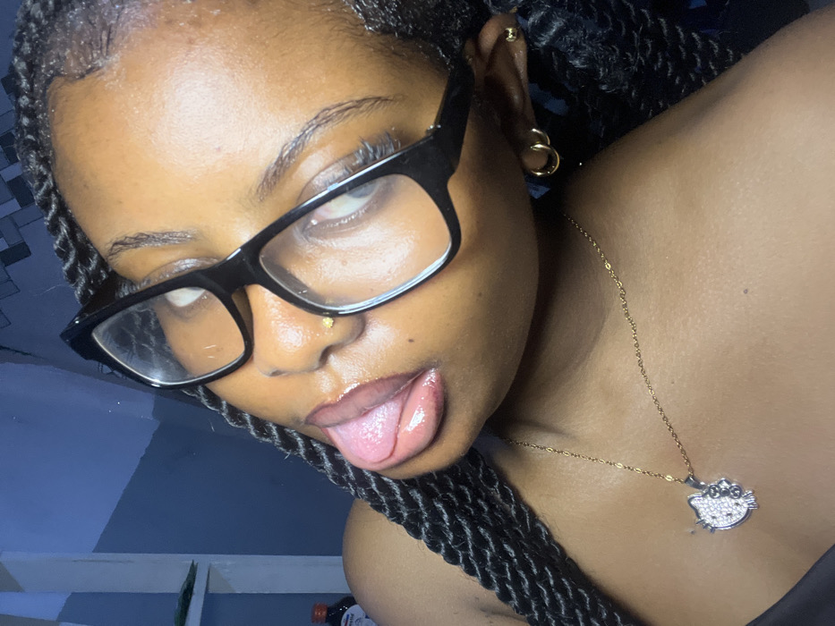 An indoor scene in Ipetumodu, Nigeria, depicts an individual with dark skin, positioned with their head tilted. The subject wears black-framed eyeglasses, through which their right eye is visible, directed slightly upwards. Their mouth is slightly open with the tongue extended, revealing glossy, pink lips. A small, gold-colored stud pierces the left nostril. The individual's left ear features two small gold hoop earrings and a single gold stud in the upper lobe. Dark braids are visible on the left side of the head and extending down. A thin gold-colored chain necklace with a silver-toned, pavé-set rhinestone Hello Kitty pendant rests on the individual's chest, which is partially visible under a dark garment. The background is a dark blue-grey wall. To the upper left, a white shelving unit is partially visible, with a dark bottle with a white label positioned on a shelf.