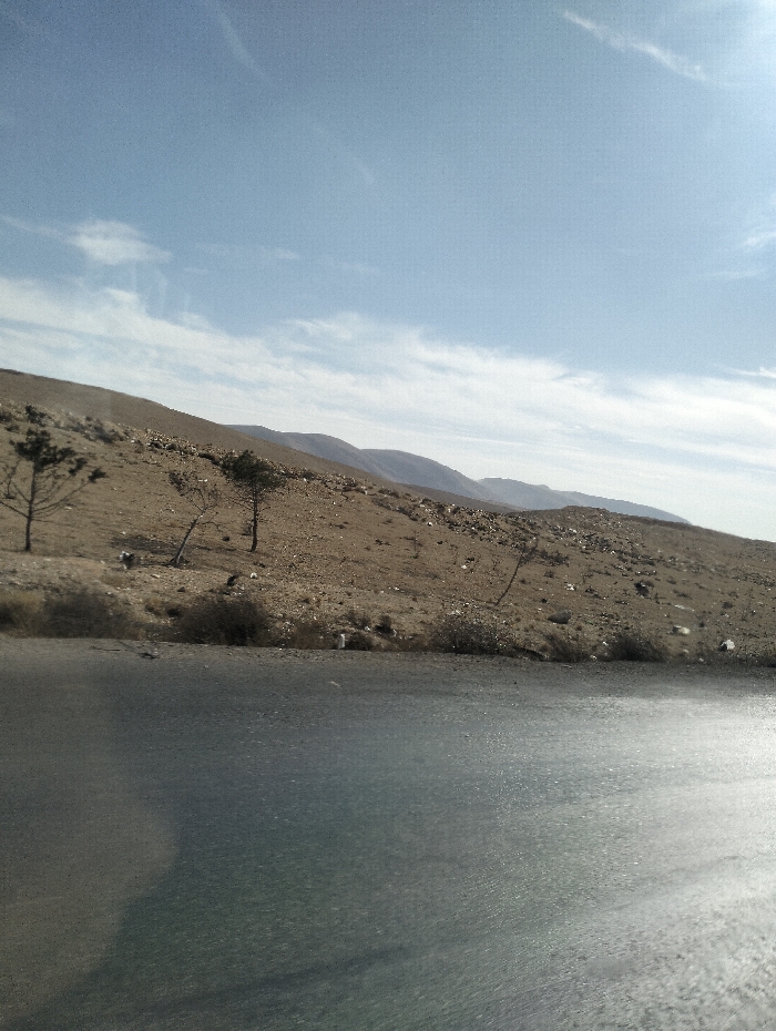 The image depicts a daytime outdoor scene along a paved road, located in the city of Hims, Syria. The foreground is dominated by a dark gray asphalt road surface, which appears to reflect light on its right side, possibly indicating moisture or strong glare. A large, indistinct dark shadow, originating from an unseen source, extends onto the left portion of the road. Immediately beyond the road, a dry, light brown hillside slopes upwards, characterized by a rocky terrain with sparse vegetation including several small, slender trees with minimal foliage and low-lying scrub. Numerous light-colored rocks are visible scattered across the hillside. In the background, successive ridges of mountains or hills recede into the distance. The sky above is light blue with scattered wispy white clouds. No people, animals, or vehicles are explicitly visible in the scene.