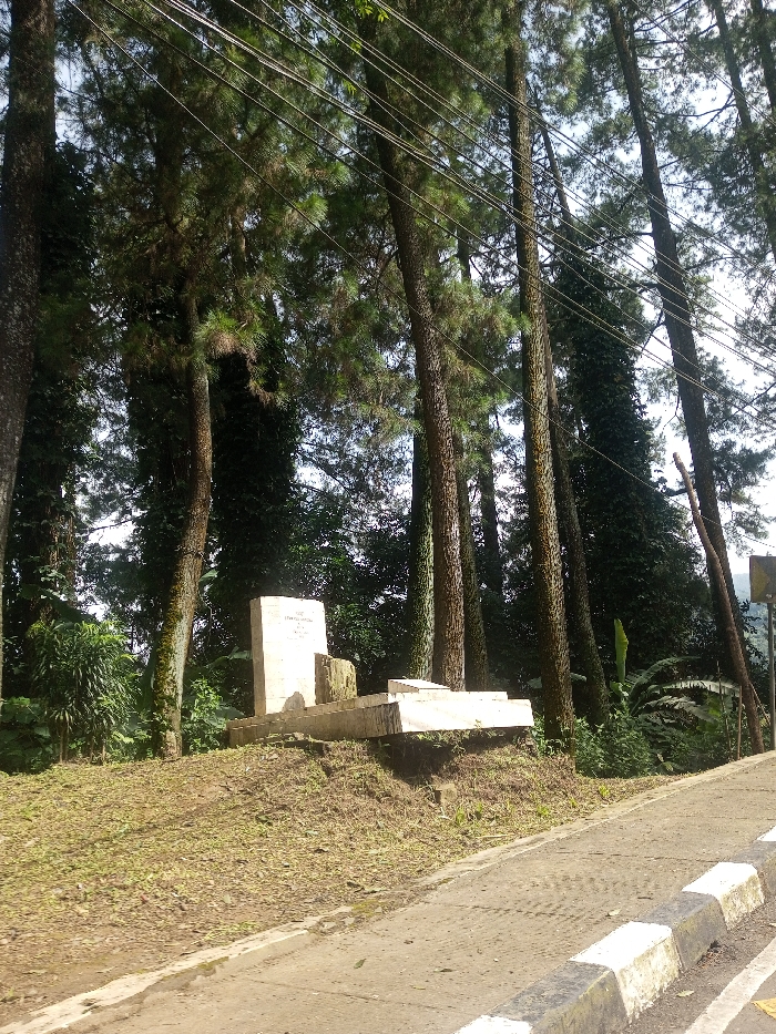A tall white monument stands amidst a grove of trees on a grassy hill. The monument has an inscription on it. The landscape is a mix of lush greenery and tall, slender trees that stretch towards the sky. High-voltage power lines are stretched above the trees. The grassy slope descends to a paved road with a white and gray painted curb, indicating the edge of the roadway.
