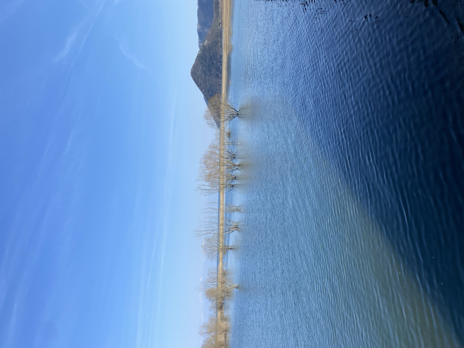 The scene depicts a natural landscape in Boljevići, Montenegro, under a clear, light blue sky with faint, high-altitude cloud trails. A large expanse of water occupies the majority of the frame, extending from the foreground to the distant horizon. Numerous deciduous trees, bare of leaves, stand partially submerged in the water, forming clusters across the midground. Several small white objects, consistent with waterfowl, are observed on the water's surface near the trees. In the distant background to the left, a low line of snow-capped mountains is visible above the water. To the right, a prominent, conical mountain, appearing dark with vegetation, rises; its base meets the water and transitions into a flat, reedy shoreline before ascending into the mountainous terrain. The foreground water exhibits a distinct horizontal bicolor division, with the right side presenting a darker blue hue and more pronounced surface ripples compared to the lighter blue, less textured water on the left. No human figures or man-made structures are present within the observable area.