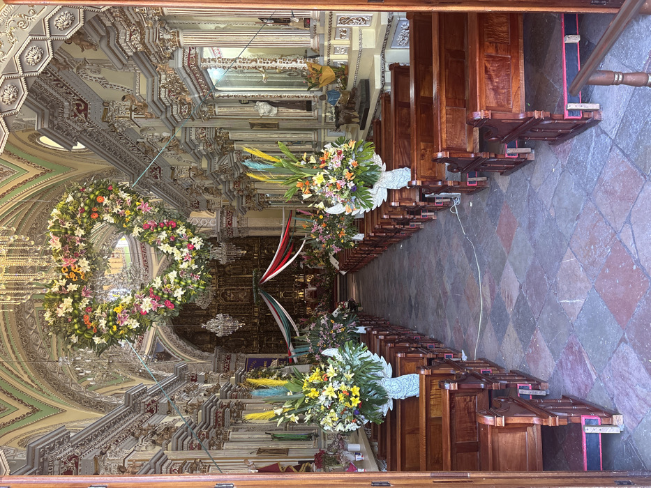 The interior of a church is adorned with elaborate floral decorations