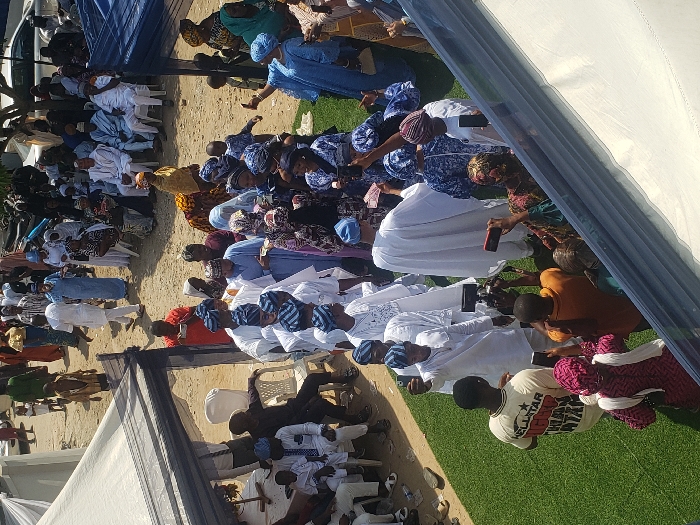 This image depicts a crowded outdoor social gathering in Ajaokuta, Nigeria, under bright daylight conditions