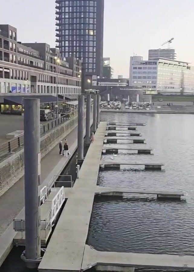 The camera pans slowly to the right, showing a cityscape and a canal with empty docks on either side. There are some people walking on the sidewalk along the docks. In the background there are several multi-story buildings and an expanse of green space on the other side of the canal. The light suggests it is either sunrise or sunset.