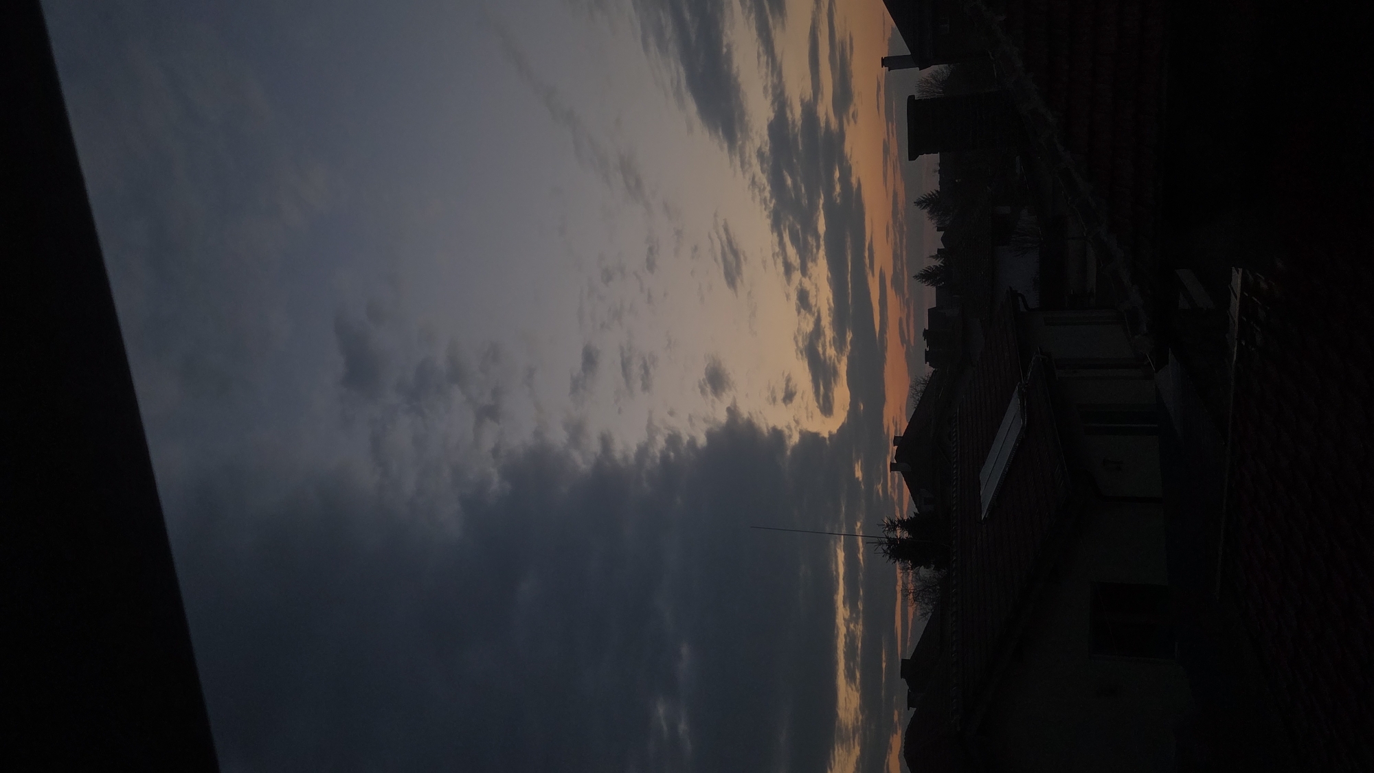 The image displays a residential neighborhood in Unknown, Unknown, at either dusk or dawn. The upper half of the frame features a sky dramatically divided; a prominent, dense dark grey cloud formation occupies the left, presenting a distinct vertical edge against a lighter expanse of orange, peach, and grey clouds to the right. The lower half of the image is dominated by an array of residential rooftops, primarily red-tiled and silhouetted against the sky. Multiple chimneys are visible across the rooftops. A specific house in the mid-left foreground features a lighter-colored facade and a rectangular, light-colored panel (possibly a skylight or solar panel) on its roof. Scattered leafless trees are interspersed among the buildings. No individuals, specific actions, or interactions are discernible within the scene.