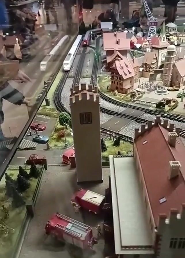 miniature train set with a town. The town includes houses, a church, a water tower, a bridge, and a fire station with fire trucks. Trains run on tracks that wind through the town. The scene is viewed through a glass barrier, reflecting the surrounding environment where people are walking. A person's hand can be seen touching the glass.