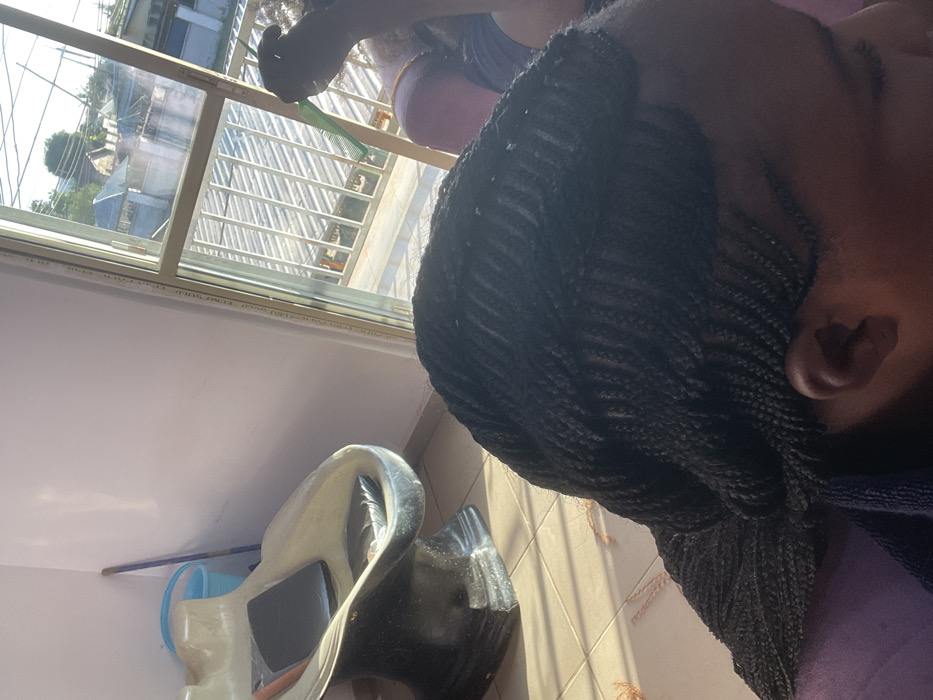 This image depicts an indoor scene within a hair salon located in Jos, Nigeria, focusing on a person receiving hair services. In the foreground, the right side of a person's head is prominently featured, displaying intricate dark micro-braids that are partially completed, forming a wave-like pattern on the side of the head and gathered volume on top. An unseen individual, presumably the stylist, has an arm and hand visible on the far right, holding a green comb near the subject's head, indicating an ongoing hair braiding process. The interior environment includes a light pink wall on the left, against which a cream-colored hair washing basin with a dark base is positioned. Inside the basin, a black tablet or phone and an orange item are visible. A blue bucket and a slender pole, possibly a broom handle, lean against the wall next to the basin. The floor is covered with light-colored tiles, illuminated by strong sunlight entering from a large glass sliding door on the right, casting distinct shadows. Scattered light brown or peach-colored strands, consistent with hair extensions, are visible on the floor near the braided head. Through the glass door, an exterior urban environment in Jos is discernible. This includes various corrugated metal rooftops, residential or commercial buildings, protective railings or fencing on what appears to be a balcony, and distant trees or vegetation. Overhead power lines are also visible against a bright sky, suggesting clear daylight conditions.