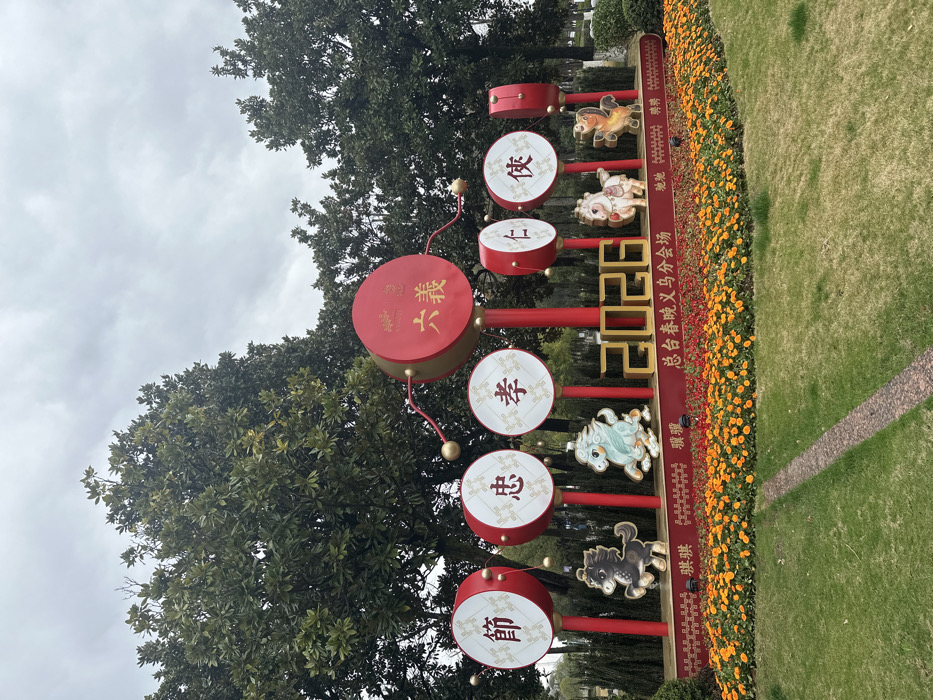 The image depicts an outdoor decorative installation in Yiwu, China, likely a temporary structure for a cultural event